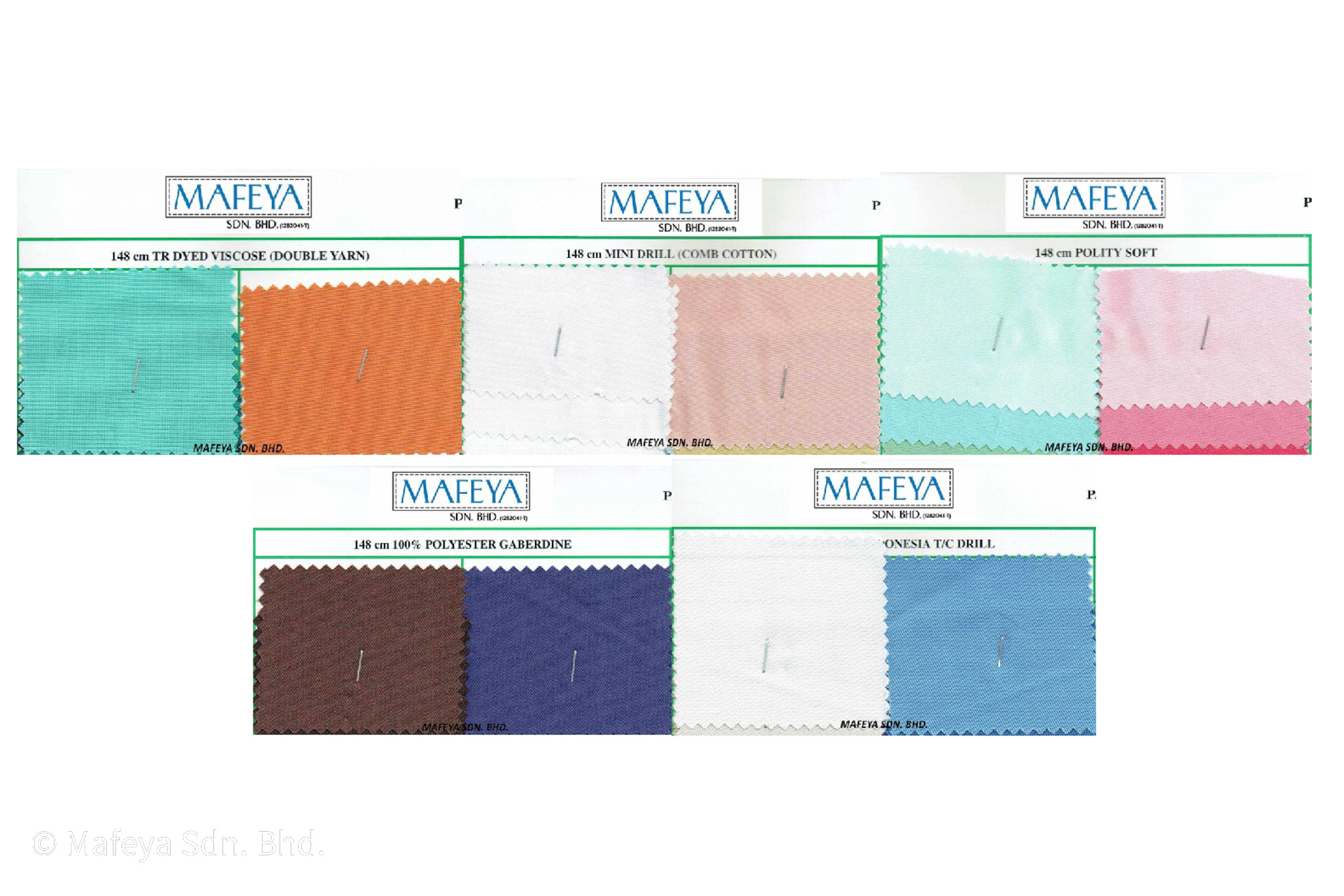 Antara pilihan fabrik yang sering digunakan termasuklah Viscose (Double Yarn), Mini Drill (Cotton Combed), T/C Drill, Polyester Gaberdine dan Polity Soft. Pemilihan kain yang sesuai amat penting dan perlu disesuaikan dengan persekitaran kerja. Sebagai contoh, bagi kakitangan yang bertugas di lapangan, fabrik yang cepat kering dan tahan lasak adalah pilihan terbaik bagi memastikan keselesaan sepanjang hari.